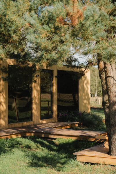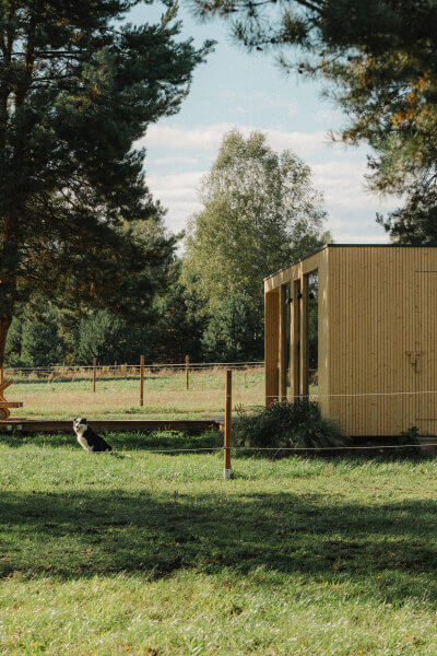 Nasze klimatyzowane domki zapewniają wygodę przez cały rok. W pełni wyposażona kuchnia, przytulne przestrzenie i widok na pastwiska.