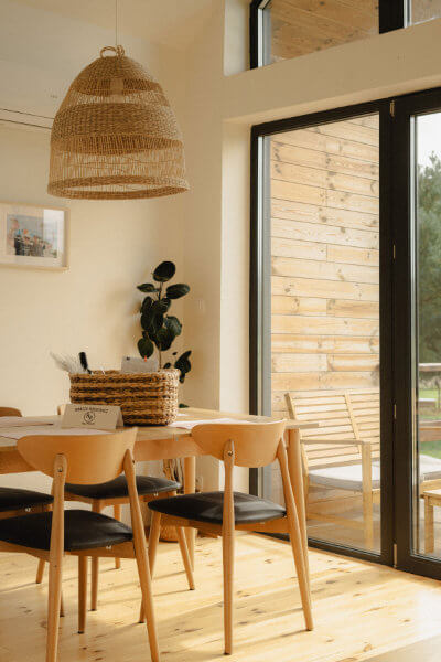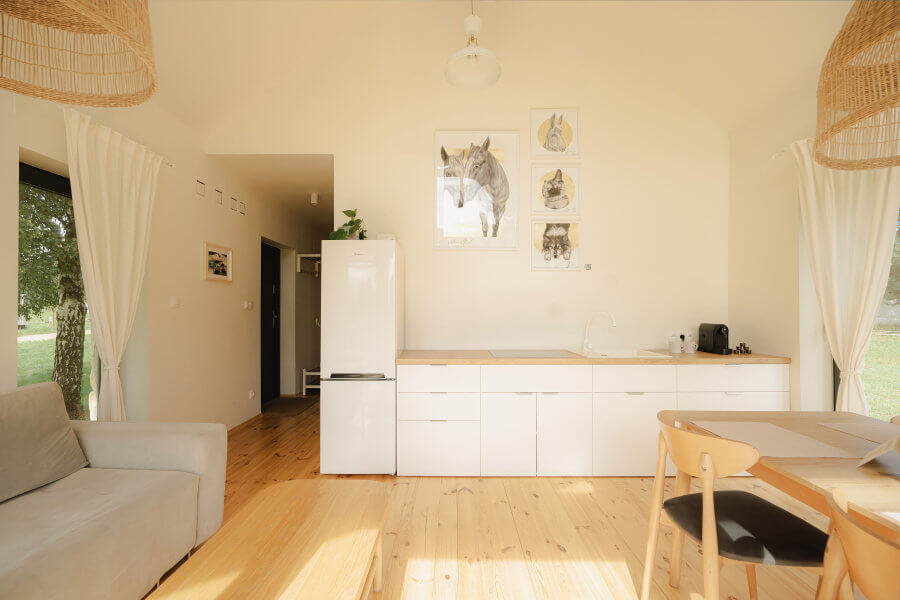 Domki posiadają dobrze wyposażone aneksy kuchenne i lodówkę. Śniadania i obiady można zamawiać z zaprzyjaźnionej, domowej firmy cateringowej, wystarczy dać nam znać jakie menu preferujecie (wegetariańskie, wegańskie, mięsne – 40 zł/obiad, 25 zł/śniadanie) lub z pizzerii w naszej okolicy. Mamy też dla Was powitalny kosz z lokalnym produktami, idealnymi do przygotowania śniadania.